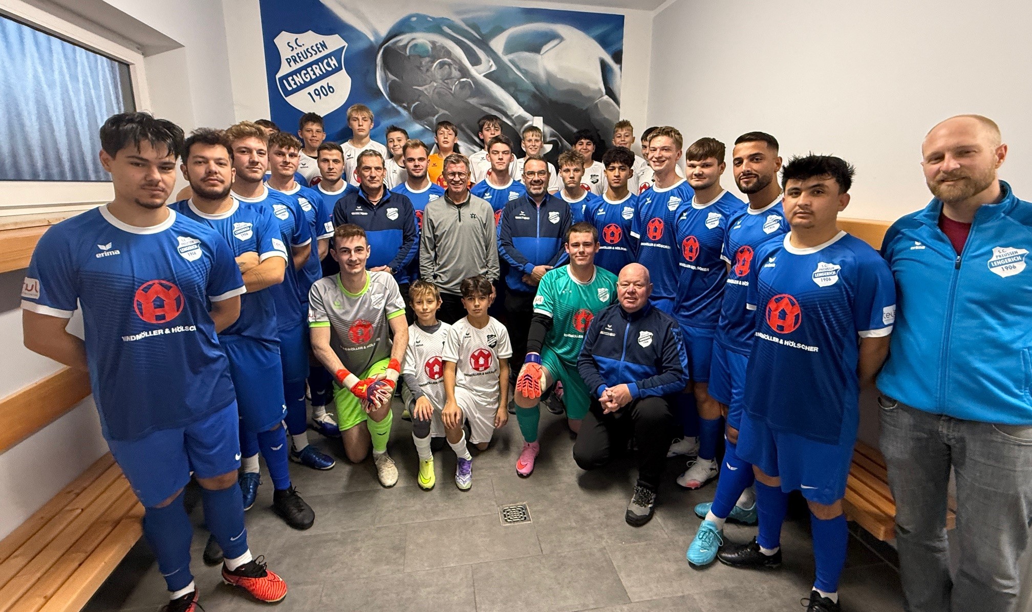 Hermann Veismann – W&H-Group Direktor Printing/Finishing (hinten Mitte) überreichte im Namen des SCP-Hauptsponsors Windmöller & Hölscher KG in der Preussen-Umkleide den nagelneuen Trikotsatz aus der Erima-Kollektion an die 1 Herrenmannschaft. SCP-Marketingvorstand Sebastian Gräler (rechts) gab im Rahmen des Besuchs einen kurzen Einblick in die Vereinsstrukturen und den aktuellen sportlichen Stand aller Preussenteams. Mit dabei waren auch die D1-Junioren, die bereits eifrig für den W&H-Cup im Januar 2026 trainieren