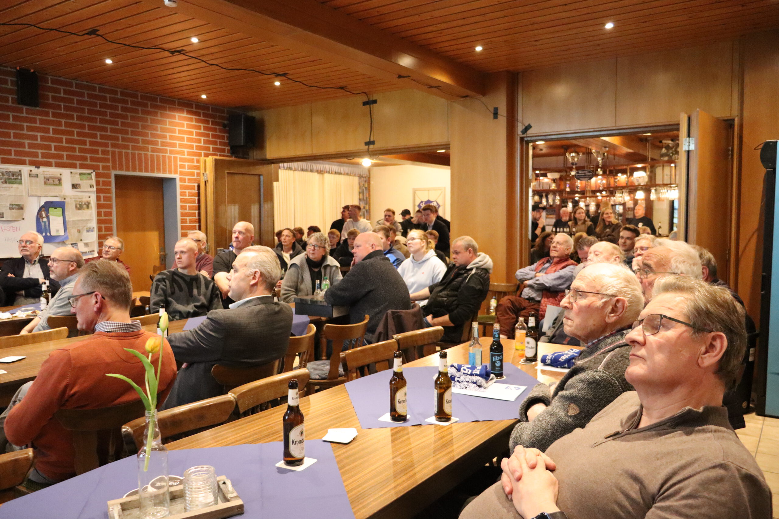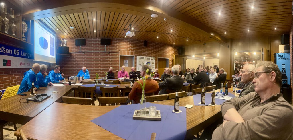 Sportvorstand Michael Stadie übernahm danach die Versammlungsleitung, deren Agenda visuell sorgfältig vom Gesamtvorstand per PowerPoint-Präsentation vorbereitet war. Traditionell zu Beginn erwiesen die Anwesenden mit einer Schweigeminute für die verstorbenen Vereinsmitglieder das Ehrengedenken. Im Mittelpunkt der Versammlung stehen alljährlich die Ehrungen langjähriger Vereinsmitglieder. Unter anerkennendem Applaus wurden zehn Personen für ihre Vereinstreue mit der Ehrenurkunde ausgezeichnet. (siehe sep. Rubrik). Bei den Mannschaftsehrungen erhielten die D2-Junioren um Trainer Stepan Kleyer für die KLC-Meisterschaft, sowie die Altherren Ü50 für die Westdeutsche Meisterschaft und den 5.Platz bei der DM-Endrunde in Berlin ihre Ehrungen. Mit vielen Fotos und Informationen konnten die Anwesenden die Höhepunkte im stichpunktartigen Jahresrückblick 2025 auf der Großbildleinwand verfolgen. Mit insgesamt 32 gemeldeten Mannschaften und knapp 1.200 Mitgliedern geht der Fußballverein in sein 120. Jahr. Den ausführlichen Bericht der sehr erfolgreichen Juniorenabteilung erstattete der neu gewählte Jugendvorsitzende Marcel Bahlke. „Fördern durch Fordern“, unter diesem Leitthema stellt er die fußballerische Juniorenausbildung bei den Preussen. Aktuell sind 25 Jugendmannschaften aus allen Altersklassen im Spielbetrieb angemeldet. „Damit sind wir kreisweit ganz vorne dabei – insbesondere im F- und E-Jugendbereich ist die Kapazitätsgrenze bereits erreicht. Was hier im Stadion an allen Wochentagen gewuppt wird, ist nur mit einem engagierten Übungsleiterteam zu bewältigen, und das funktioniert zum Glück sehr gut“, berichtete Bahlke nicht ohne gewissen Stolz auf sein Team. Mit einem Blumenstrauß und Präsent wurde Kerstin Fangmeyer verabschiedet, die nach vielen Jahren aus gesundheitlichen Gründen als Jugendvorsitzende ihr Amt nun an ihren Stellvertreter übergab. Es schlossen sich die Kurzberichte der Spartenverantwortlichen und Trainer von den Seniorenteams, den Damen, Altherren über die Oldies bis zur Badmintonabteilung an. Insbesondere 1. Herrentrainer Stefan Kilfitt bedankte sich ausdrücklich bei Sportvorstand Michael Stadie für die stetige Loyalität und Rückendeckung des Vereins, auch in schwierigen Phasen. „Unsere blutjunge Truppe braucht sicher noch etwas Zeit für die Entwicklung, aber das Ziel Bezirksliga behalten wir ganz klar im Auge“, erklärte er auch mit Blick auf den Trainerwechsel zur neuen Saison.