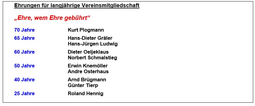 v.l.: Hans-Dieter Gräler (65 Jahre), Andre Osterhaus (50 Jahre), Erwin Knemöller (50 Jahre), Norbert Schmalstieg (60 Jahre), Günter Tierp (40 Jahre), Dieter Oeljeklaus (60 Jahre), Roland Hennig (25 Jahre