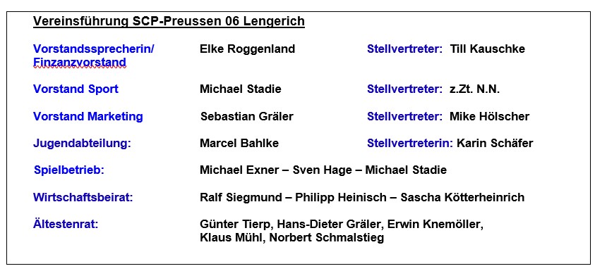 Den detaillierten Jahresabschluss der Finanzen erstatte der stellvertretende Finanzvorstand Till Kauschke. Dank des transparenten Controllings durch das neue Buchungssystem konnte trotz der Ausgaben für erforderliche Investitionen ein stattliches Plus erwirtschaftet werden, das dem Verein wieder eine solide Kassenlage beschert. WBR-Sprecher Ralf Siegmund erstatte den Prüfungsbericht des Wirtschaftsbeirates zum Jahresabschluss, der ohne Beanstandungen ausfiel. Er hatte viel Lob für den äußerst rührigen Vorstand parat, kritisierte jedoch gleichzeitig, die seiner Meinung nach verbesserungswürdige materielle Wertschätzung für die ehrenamtliche Vereinsarbeit durch Rat und Verwaltung der Stadt Lengerich. Danach bat er um Entlastung des Gesamtvorstandes, dem die Versammlung ohne Gegenstimme nachkam. Die Neuwahl des geschäftsführenden Vorstandes leitete SCP-Ehrenvorsitzender Klaus Fleige. Dabei wurden Elke Rogenland (Vorstand Finanzen/Vorstandssprecherin), Michael Stadie (Vorstand Sport) und Sebastian Gräler (Vorstand Marketing) ohne Gegenstimme wiedergewählt. Im erweiterten Vorstand wird die bislang vakante Stelle stv. Vorstand Marketing durch Mike Hölscher neu besetzt. Den Spielbetrieb koordinieren Michael Exner, Sven Hage und Michael Stadie im Team. En bloc wiedergewählt wurde der Wirtschaftsbeirat mit Ralf Siegmund, Philipp Heinisch und Sascha Kötterheinrich. Auch der Ältestenrat mit Günter Tierp als Sprecher bleibt im Amt. Außerordentliche Anträge zur Mitgliederversammlung wurden nicht eingereicht. Unter Punkt Verschiedenes stellte Michael Stadie anhand einiger Fotos die kurz bevorstehende Neuanschaffung eines hochwertigen Verkaufspavillons vor. Aufgrund dringend erforderlicher räumlicher Kapazitäten und nach langen Verhandlungen wird der Verein ab dem 1. April nun die ehemalige Hausmeisterwohnung im 1.OG von der Stadt anmieten. Sie wird derzeit in Eigenregie von Grund auf renoviert und beherbergt zukünftig Büro- Material- und Besprechungsräume. Im Sommer ist anlässlich des 120jährigen Bestehens im Stadiongelände ein großes Vereinsfest mit Turnierspielen geplant. Nach zwei Stunden schloss die Sportvorstand Michael Stadie eine harmonische, gut besuchte Versammlung und leitete auf den geselligen Teil über.