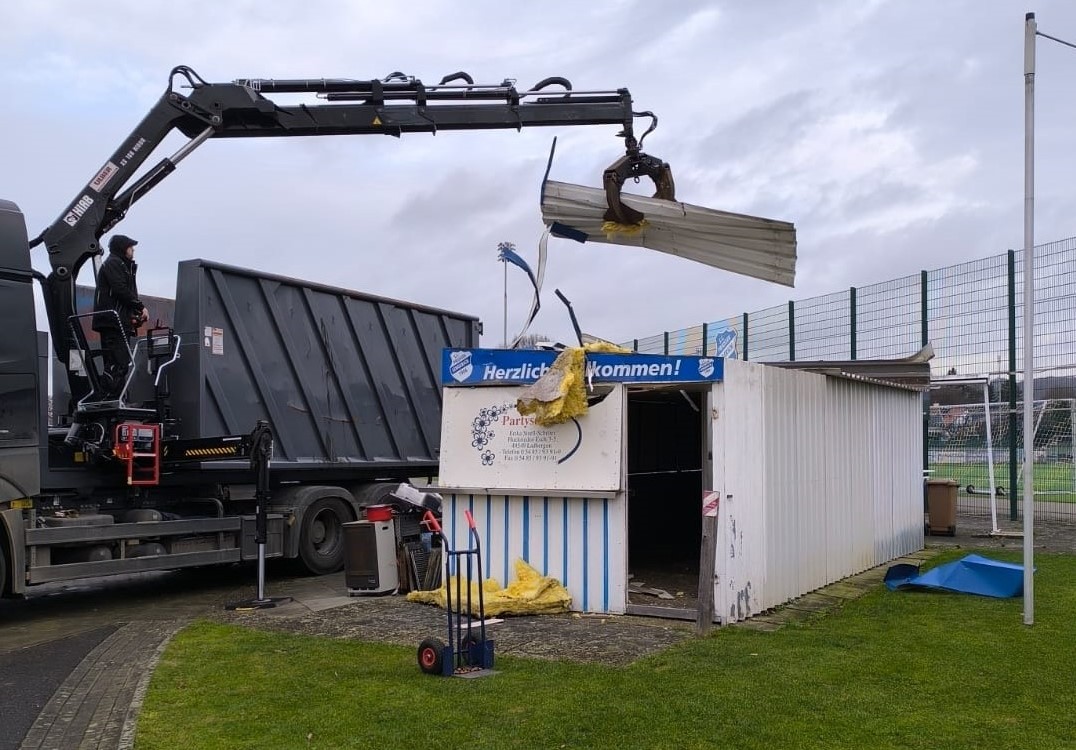 Die bevorstehende Weihnachts- und Winterpause 2025/26 nutzt der SC Preussen 06 zu bereits detailliert vorgeplanten Abriss- und Erneuerungsmaßnahmen im städtischen Stadiongelände. Mit schwerem Gerät ging es jetzt dem vereinseigenen Verkaufspavillon und dem fünf Meter hohen Sprecherturms am Hauptplatz an den Kragen. Beide Einrichtungen wurden im Jahr 1993 unter der Regie von Wilhelm Kohne, Heinrich Howe und Horst Tenfelde in Eigenleistung errichtet. Die Preussen spielten seinerzeit erfolgreich unter den Trainern Holtgrave und Jurak in der Verbandsliga, so dass für die Presse- und Öffentlichkeitsarbeit aufgerüstet werden musste, ist noch in der Chronik zum 100.Jubiläum zu lesen. Legendär waren später auch die Telefon-Liveübertragungen vom Sprecherturm durch Radio RST mit Sportreporter Rolf Radermacher. „Dann wurde es da oben ganz schön eng und wackelig für die Stadionsprecher Klaus Mühl und Norbert Plogmeier“, hat SCP-Ältestenratssprecher Günter Tierp noch gut in Erinnerung. Auch der recht stabile Preussen-Pavillon hat über dreißig Jahre gute Dienste geleistet und so manche Stadionwurst ist über die Edelstahltheke gegangen. Inzwischen aber nagt der Zahn der Zeit jedoch mächtig am Material, besonders der hohe Sprecherturm hat seine Standfestigkeit eingebüßt. Während dank moderner Tontechnik auf die Ersatzbeschaffung eines Sprecherturmes verzichtet wird, ist beim Verkaufspavillon jedoch zwingend Ersatz erforderlich. Die Kosten für einen modernen vollausgestatteten Verkaufscontainer in der Größe von 8 x 3 Metern werden im fünfstelligen Bereich liegen, hat SCP-Sportvorstand Michael Stadie mit seinem Arbeitskreisteam ermittelt. Dazu kommen noch der Abriss und die Entsorgung. „Leider gibt es keinerlei öffentliche Fördermittel und wir müssen alles aus eigenen Rücklagen stemmen“, bedauert SCP-Finanzvorstand Elke Roggenland. Zur Mitfinanzierung dient der zweckgebundene Erlös aus dem erfolgreichen Benefiz-Betriebsfußballturnier im September dieses Jahres. In Kürze erfolgen nun die finalen Einrichtungsplanungen, so dass Anfang 2026 passend zum Start nach der Winterpause die neue Einrichtung in Betrieb gehen kann.
